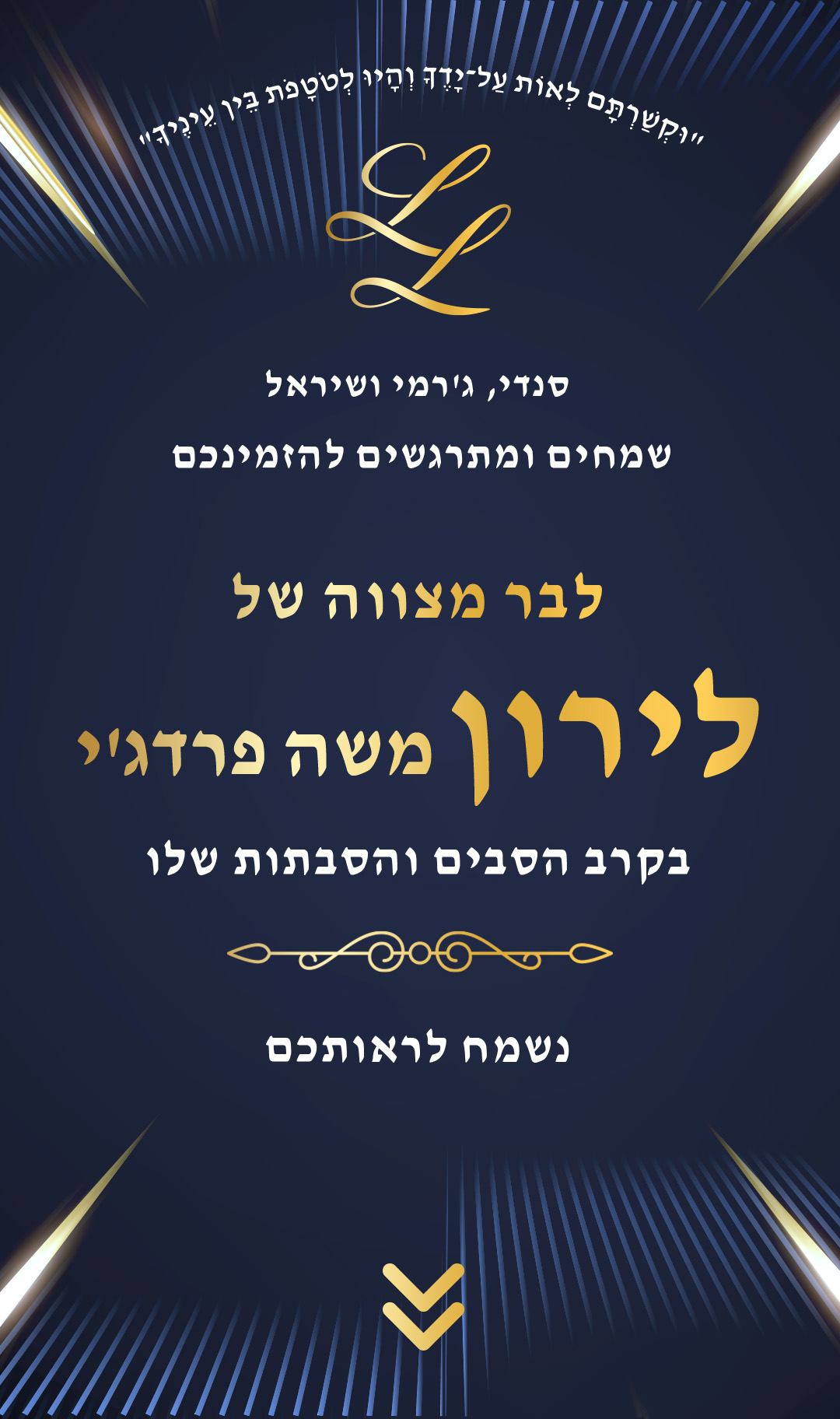 הנכם מוזמנים לחגוג איתנו את בר מצווה של לירוןWIN המסיבה תיערך באולמי יום שלישי, 12 בדצמבר 202319:30 בשעההתלם 1 פארק התעשיה עמק חפר